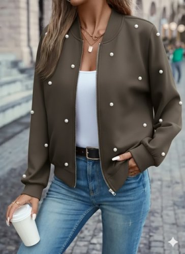 • Kadın uzun kollu önden fermuarlı incili kısa modal ceket